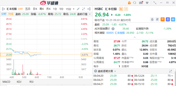 截至北京时间18:19,汇丰美股盘前跌近7%。
