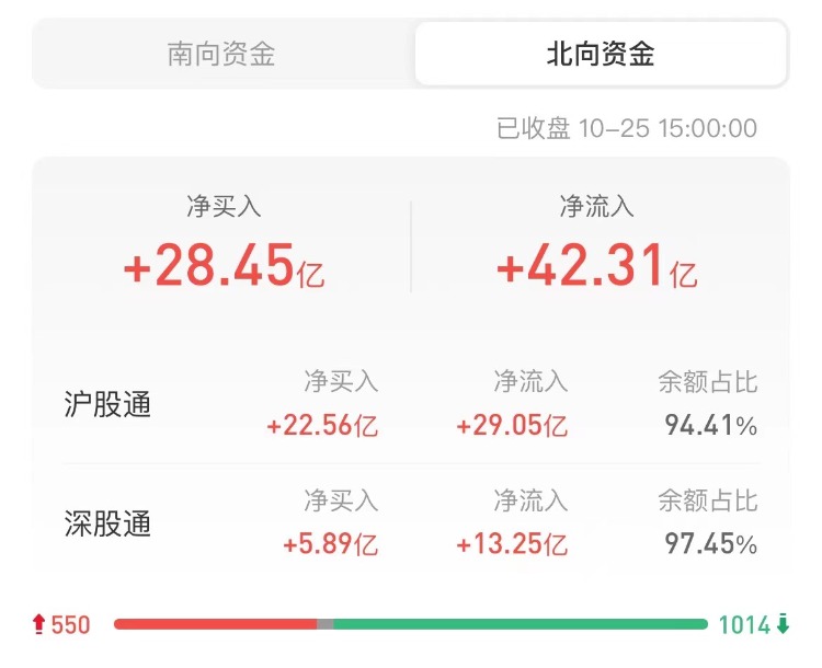 北上资金今日净买入28.45亿元,沪股通净买入22.56亿元,深股通净买入5.89亿元。上一交易日净卖出179.12亿元。