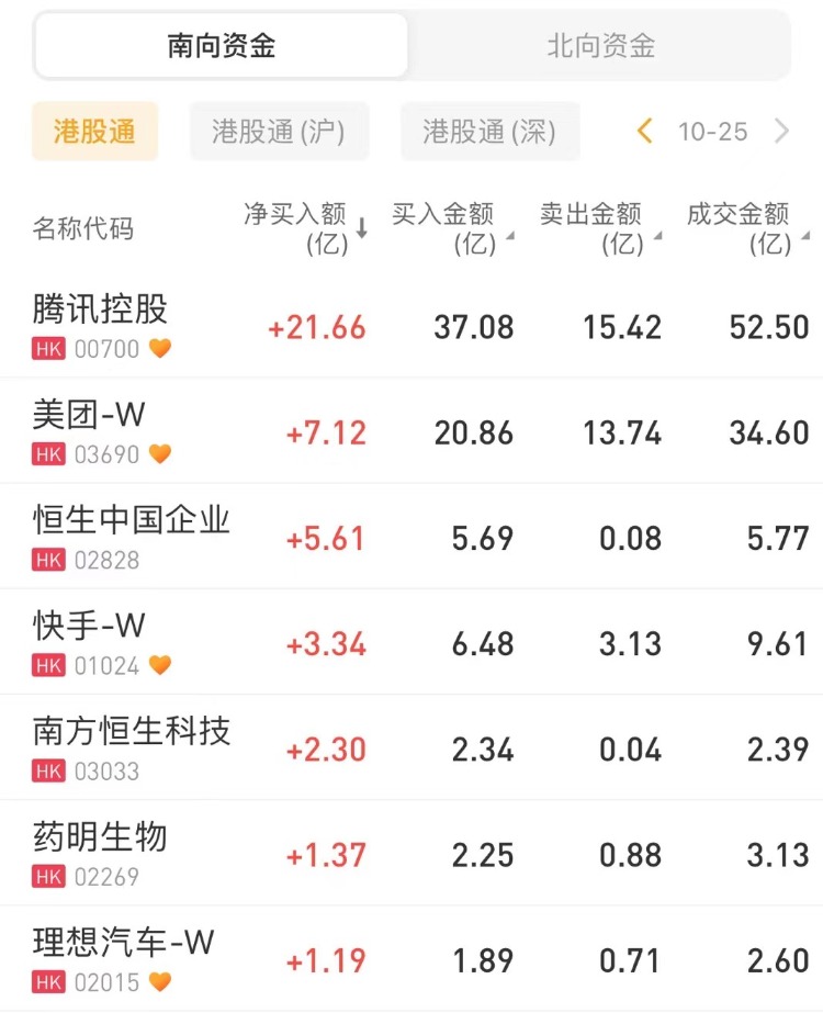 南下资金净买入腾讯控股 $00700.HK 21.66亿港元,净买入美团-W $03690.HK 7.12亿港元。此外,恒生中国企业 $02828.HK 获净买入5.61亿港元,快手-W $01024.HK 获净买入3.34亿港元。