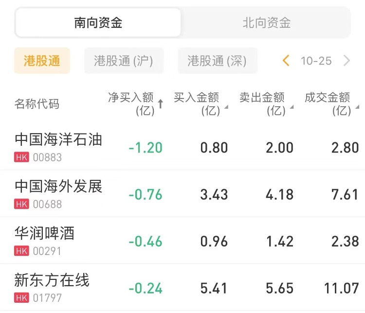 南下资金净卖出中国海洋石油 $00883.HK 1.20亿港元,为今日卖出之最。净卖出中国海外发展 $00688.HK 0.76亿港元,华润啤酒 $00291.HK 遭净卖出0.46亿港元。