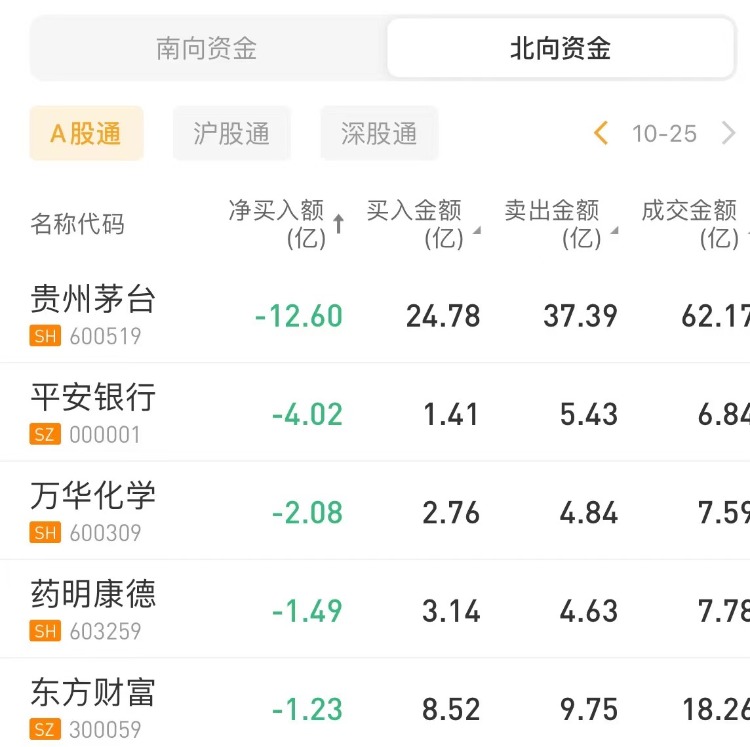 今日北上资金净卖出贵州茅台 $600519.SH 12.60亿元,平安银行 $000001.SZ 遭净卖出4.02亿元。