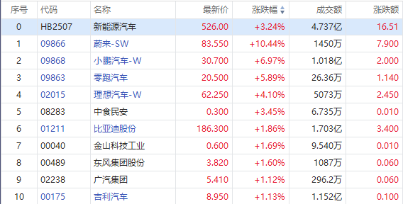 华盛资讯10月26日讯,港股汽车股集体反弹,截至发稿蔚来升超10%领涨板块,小鹏汽车现涨6.97%,零跑汽车涨5.89%,理想汽车涨超4%,比亚迪现涨1.86%。