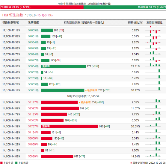 街货分布方面,恒指在牛证街货在收回价14500点至15000点之间,累计相当约3128张期指合约;恒指熊证街货在收回价16100点至16600点之间,累计相当约1693张期指合约。