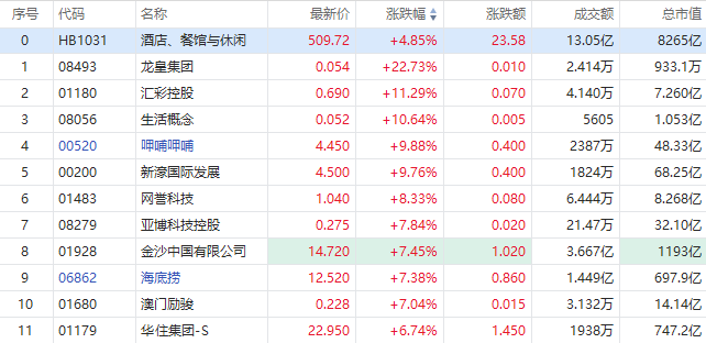 华盛资讯11月1日消息,港股节假日概念股午后持续走高,呷哺呷哺、美团涨超9%,华润啤酒、携程集团涨超8%,青岛啤酒股份涨超7%,华住集团涨近7%。同程旅行、百威亚太涨近5%。餐饮股方面,海底捞涨近8%,奈雪的茶涨近7%,九毛九涨约4%。