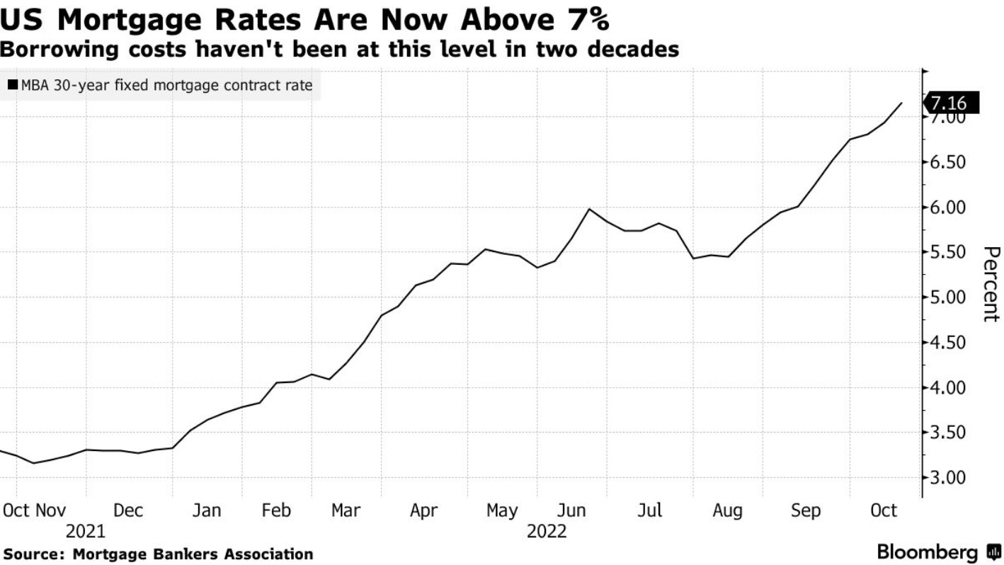 智通财经 APP 获悉,美国抵押贷款银行协会(MBA)周三公布的数据显示,截至10月21日当周,美国30年期固定抵押贷款合约利率上升22个基点,至7.16%,为连续第十次上升。这是美国抵押贷款利率20多年来首次超过7%,延续了一系列阻碍住房需求的急剧上升。