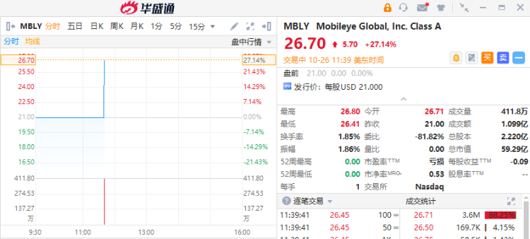 华盛资讯10月26日消息,英特尔旗下自动驾驶子公司Mobileye今日登陆纳斯达克市场开始交易,首挂涨超27%,股价报26.7美元。