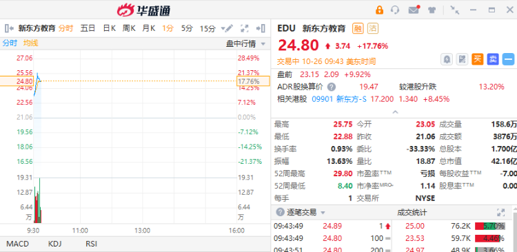华盛资讯10月26日消息,美股盘初,热门中概股多数走强,截至发稿,新东方教育涨近18%,报24.8美元。此前,公司公布第一财季净利润6600.2万美元,同比增长9%。中国海外互联ETF $KWEB 涨超4%。