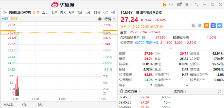 腾讯ADR涨超5%,报27.24美元,成交额1704万美元。