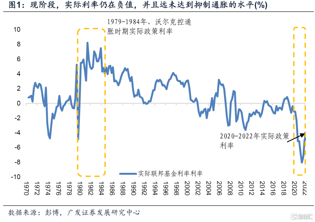 第一,实际政策利率仍在负值,若以1980年代沃尔克(Paul Volcker)控通胀时期的实际政策利率来看,现阶段的实际政策利率依然无法有效控制通胀。9月FOMC经济预测显示,年末联邦基金利率将达到4.4%水平,根据我们对通胀的判断,CPI同比增速在年末仍可能维持在7%左右水平(详见下文),导致实际政策利率距离正值仍有较大距离,也就是说,加息空间依然较大。