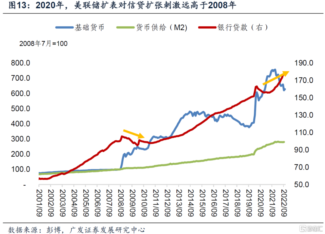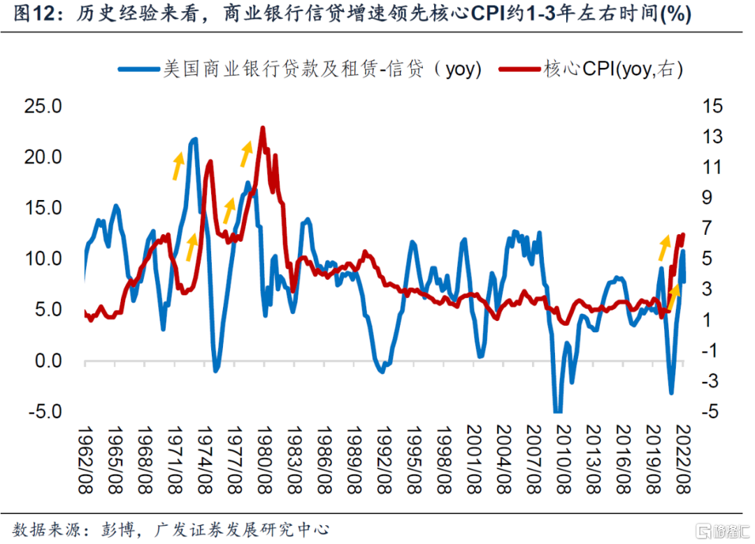 2008年次贷危机之后一直到2013年年末,美联储将基础货币供给扩大了349%,而在此期间,货币供给(M2)增加了44%,信贷仅仅增加了7%,也就是说,年均信贷增速仅为1.4%。2020年新冠疫情之后,基础货币从2020年2月的3.45万亿美元升至2022年9月的6.4万亿美元,增长86%,货币供给增长41%,而信贷规模快速增长16%,与2008年时期形成鲜明对比。从历史数据来看,商业银行信贷增速对核心CPI确实有领先作用,且领先实践大约是1-3年。