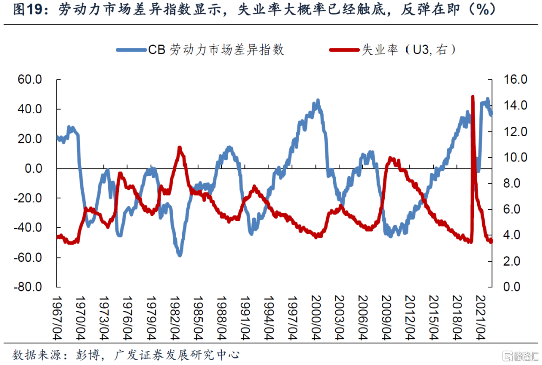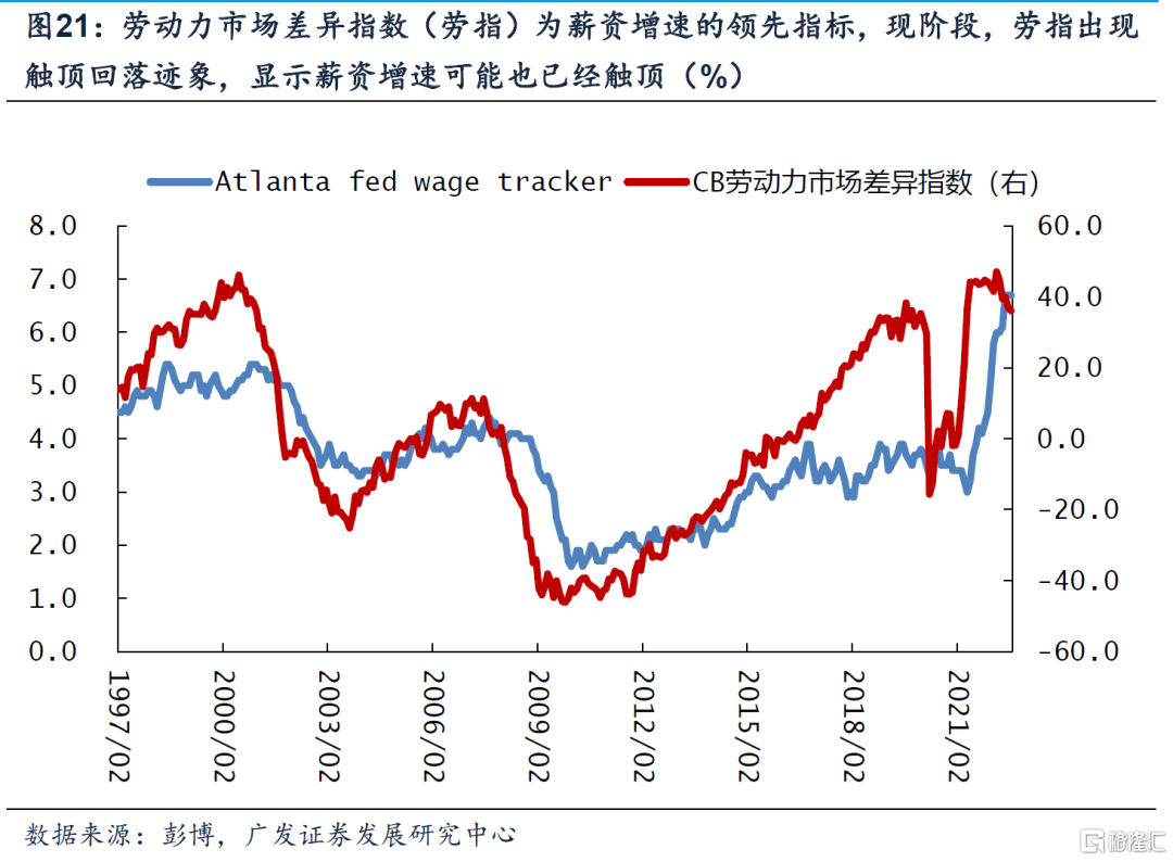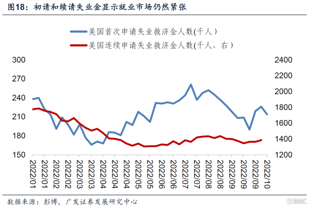 劳动力薪资的涨幅,主要基于就业市场紧张程度以及居民短期通胀预期。初请和续请失业金人数、劳动力供需缺口、以及劳动力市场差异指数是我们观测劳动力市场是否紧张的关键变量。三方面数据均显示短期内就业市场依然坚挺,但已经开始出现疲软迹象,失业率大概率见底、薪资增速见顶。