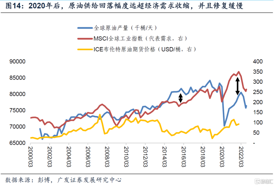 因此,我们取MSCI工业生产指数作为经济周期的代表,MSCI工业指数越高,说明经济越繁荣,对原油的需求就越高,反之亦然。2020年以后,原油产量显著收缩,虽然全球经济在2021年强势反弹,但原油产量却远不及预期,并没有修复至疫情前水平。此外,MSCI 工业指数虽较2021年高点回落,但维持高位。