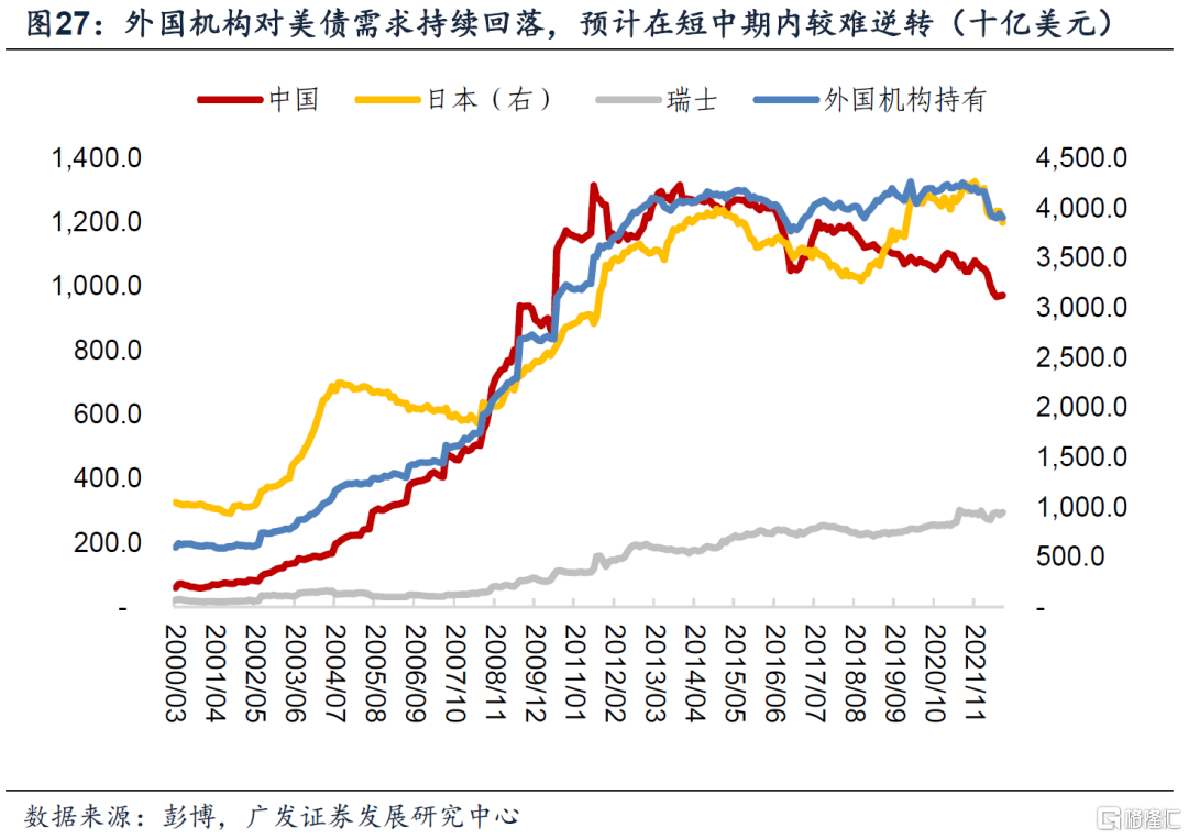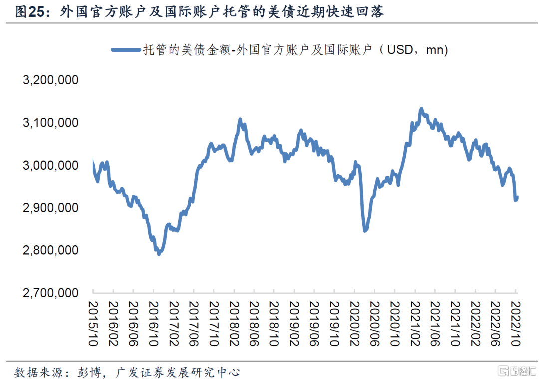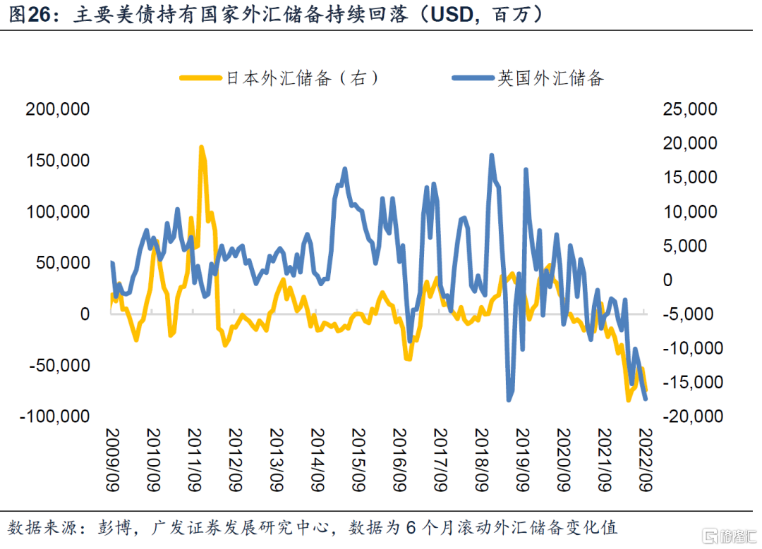美债需求方面, 美联储强势加息, 叠加外部环境的不确定性抬升(英国LDI危机以及日本持续的量化宽松), 导致外国央行维持货币稳定的意愿较强, 而维稳的主要渠道, 则是抛售美债。可以看到, 外国官方账户及国际账户托管的美债规模近期快速回落,此外, 主要美债持有国家, 如中、日、瑞的外汇储备持续回落。美元指数的走强(美联储加息),将进一步给外国央行带来维护汇率稳定压力,引导抛售持续。