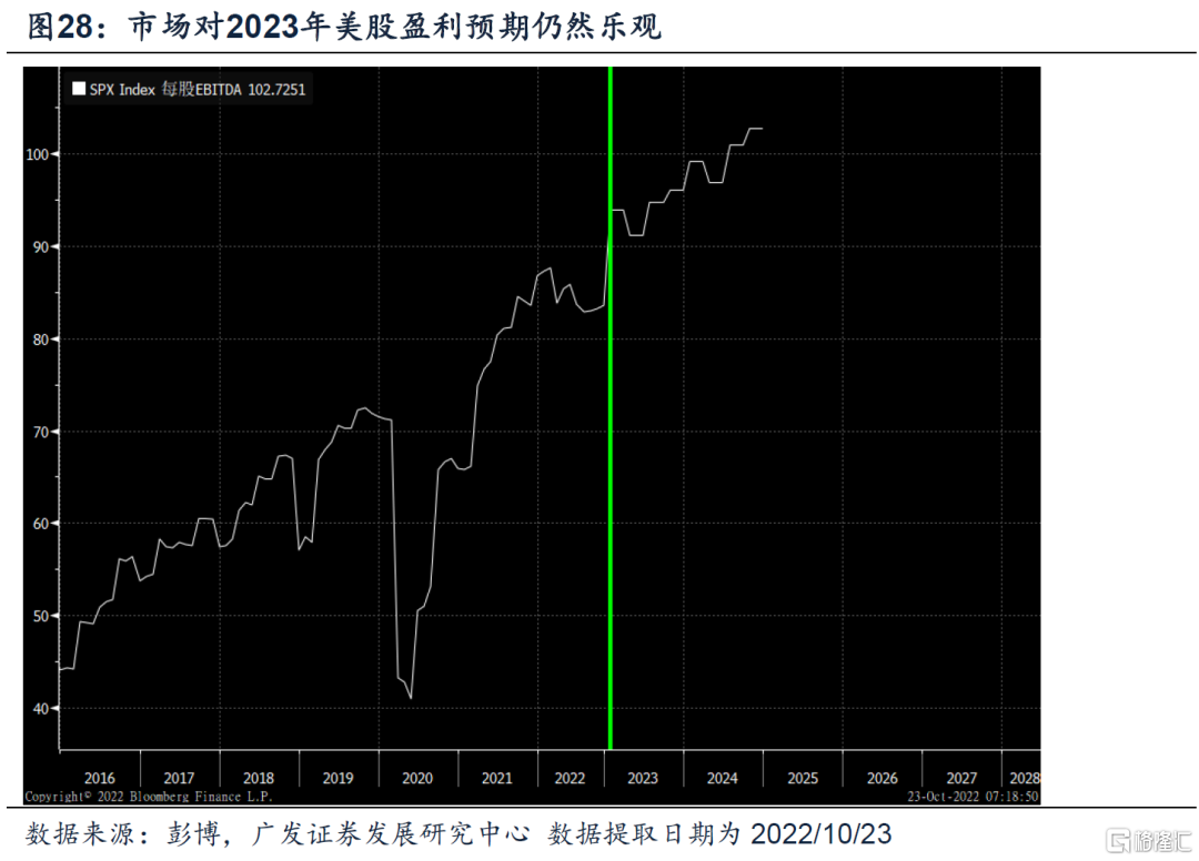 市场对美股盈利预期过于乐观。现阶段,美股正在遭受估值端和盈利端的两重冲击。一方面,如前文所述,美联储持续强势加息抬升贴现率水平,挤压美股估值;另一方面,需求减弱、劳动力成本抬升,以及强势美元对公司海外业务的冲击,都对美股盈利不利。