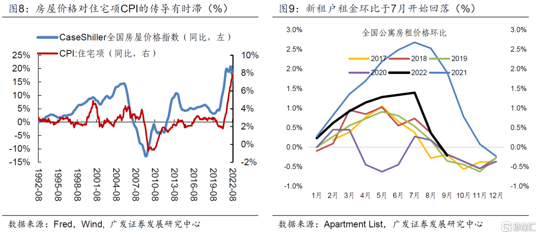 近期美国房屋价格指数回落,叠加消费者信心指数回落导致市场开始博弈美联储12月加息幅度可能下调至50bp,但房屋价格以及最新房租价格对住房项的传导有经验时滞,导致住房项CPI的确定性回落可能要到明年才能够显现。美国劳工局统计住房项价格的方法,主要是基于现有租户租金的调查样本,而新租户租金以及最新房价对CPI住房项的传导通常需要6-12个月时间。因此,在通胀数据没有确定性回落、美国经济仍有韧性的背景下,判断美联储将持续收紧,11月和12月会议各加息75bp。