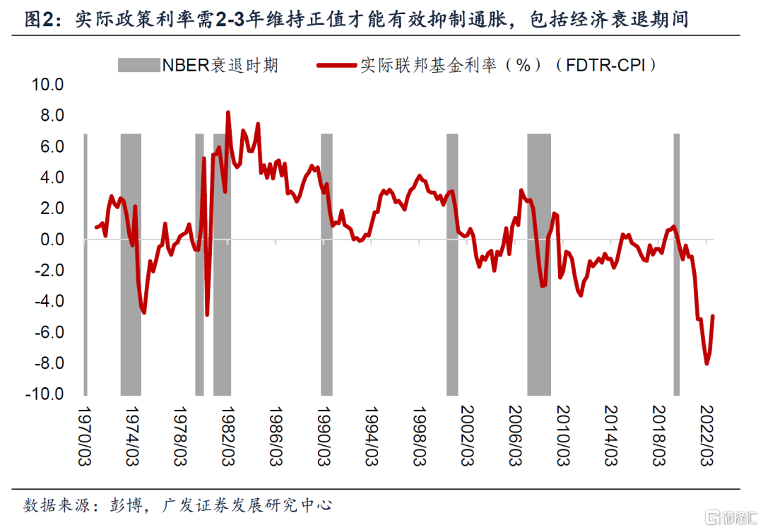 在9月21日FOMC新闻发布会中,美联储主席鲍威尔提到,全曲线实际利率回正(real rates are positive across the entire yield curve)是衡量货币政策是否合理的依据之一。我们从三个角度观测实际利率后发现,政策利率过低,通胀过高,导致联邦基金实际利率、短期国债实际收益率、实体部门实际贷款利率都未回到正值。因此,除非典型的衰退情形出现,否则美联储大概率会继续推进加息步伐;在“全曲线实际利率回正”的明确目标下,美联储甚至能接受一定程度浅衰退。此外,从1979-1982年控通胀的经验来看,实际政策利率需要在一段时间内(2-3年左右)维持正值,才能有效抑制通胀。