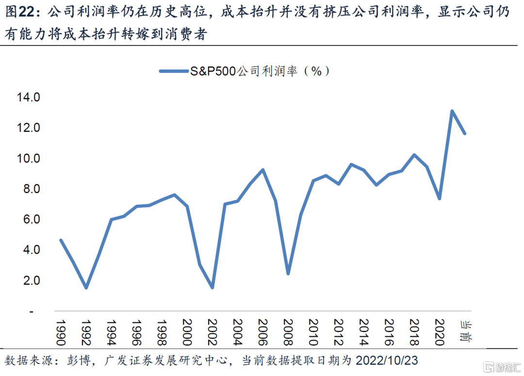 虽然数据显示,就业市场最火热的时期已经过去,但薪资增速的回落将是缓慢的。一则,历史数据显示,短期通胀预期与薪资增速有较强的相关性,支撑工资增速。现阶段,密歇根大学1年通胀预期处于4.8%左右高位,抬升居民涨薪的意愿。二则,薪资增速的领先指标,劳动力市场差异指数刚开始触顶,其对薪资增速的传导还处于初级阶段。三则,公司依然有能力将成本转嫁到消费者身上。彭博数据显示,S&P500公司利润率仍在历史高位,显示公司仍有能力成功将成本压力转嫁到消费者。