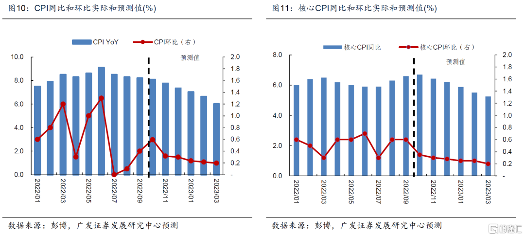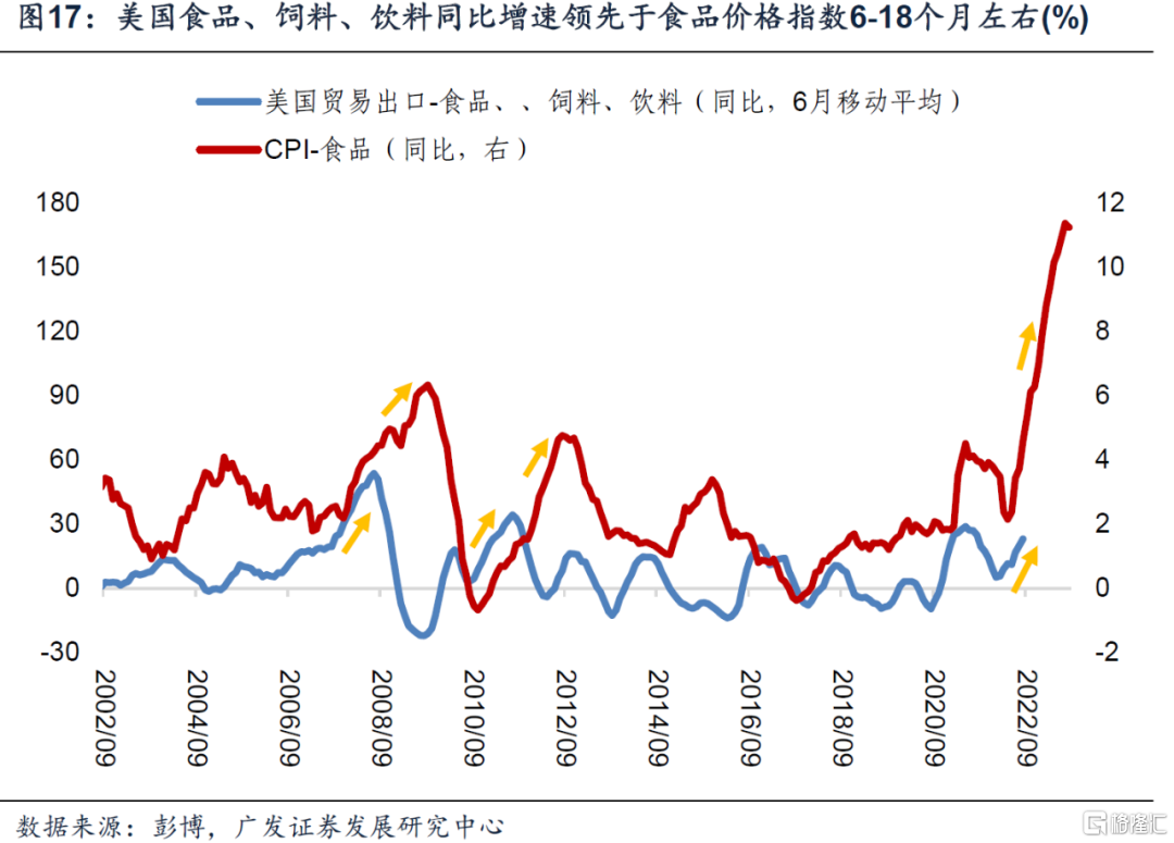 食品价格短中期内较难回落。CPI食品价格同比增速自2021年5月开始快速走高,2022年9月同比为11.2%,环比为0.8%;展望来看,因食品出口仍在持续走强,能源价格维持高位,短中期内食品价格仍有上行空间。参照历史,美国食品、饲料、饮料出口的同比增速领先美国食品CPI同比增速约6-18个月的时间,主要由于美国自身农业产能向外分流后,对自身农产品供给形成挤压,叠加2021年以来,原油价格持续上行,抬升农产品的运输成本,造成美国食品零售价格持续走强。