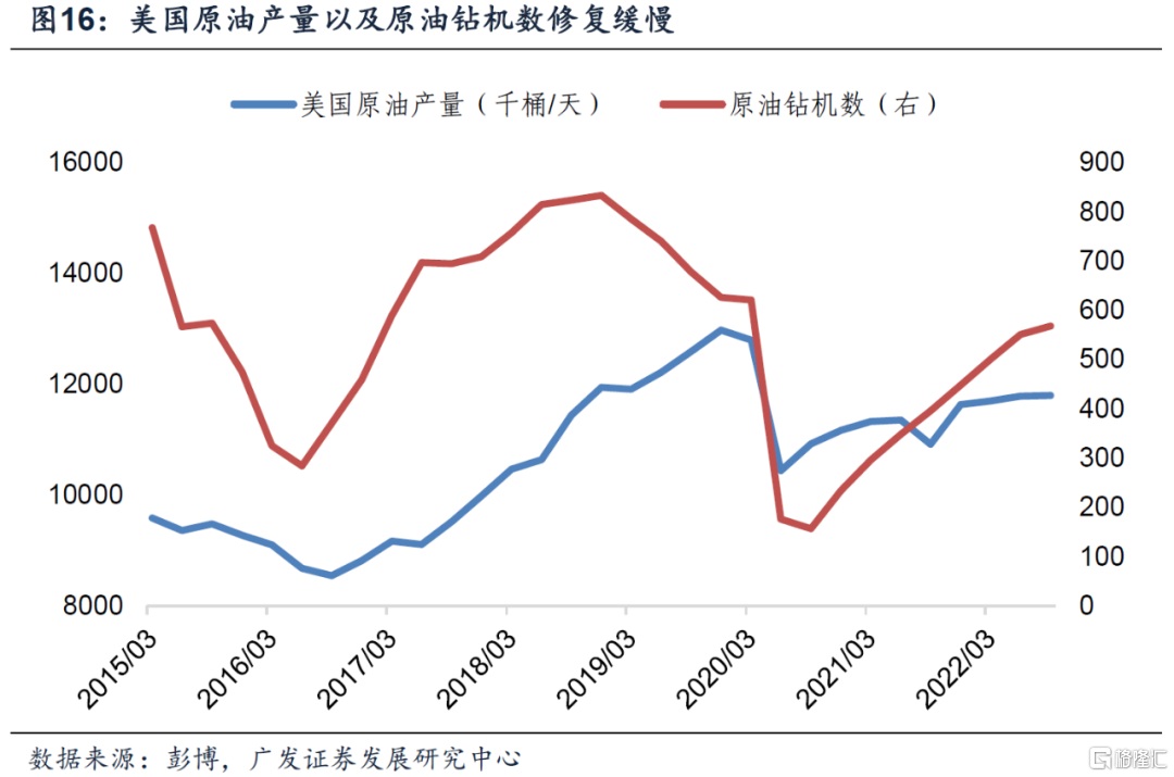 原油价格方面,历史经验来看,全球原油产量变化跟随经济走势波动,然而,2020年后,原油供给回落幅度远超需求收缩,并且修复缓慢,基于对OPEC产量修复不及预期,叠加美国自身原油产量修复疲弱、战略石油储备不可持续,预计原油价格仍有较强支撑,并且有再度回升的可能。
