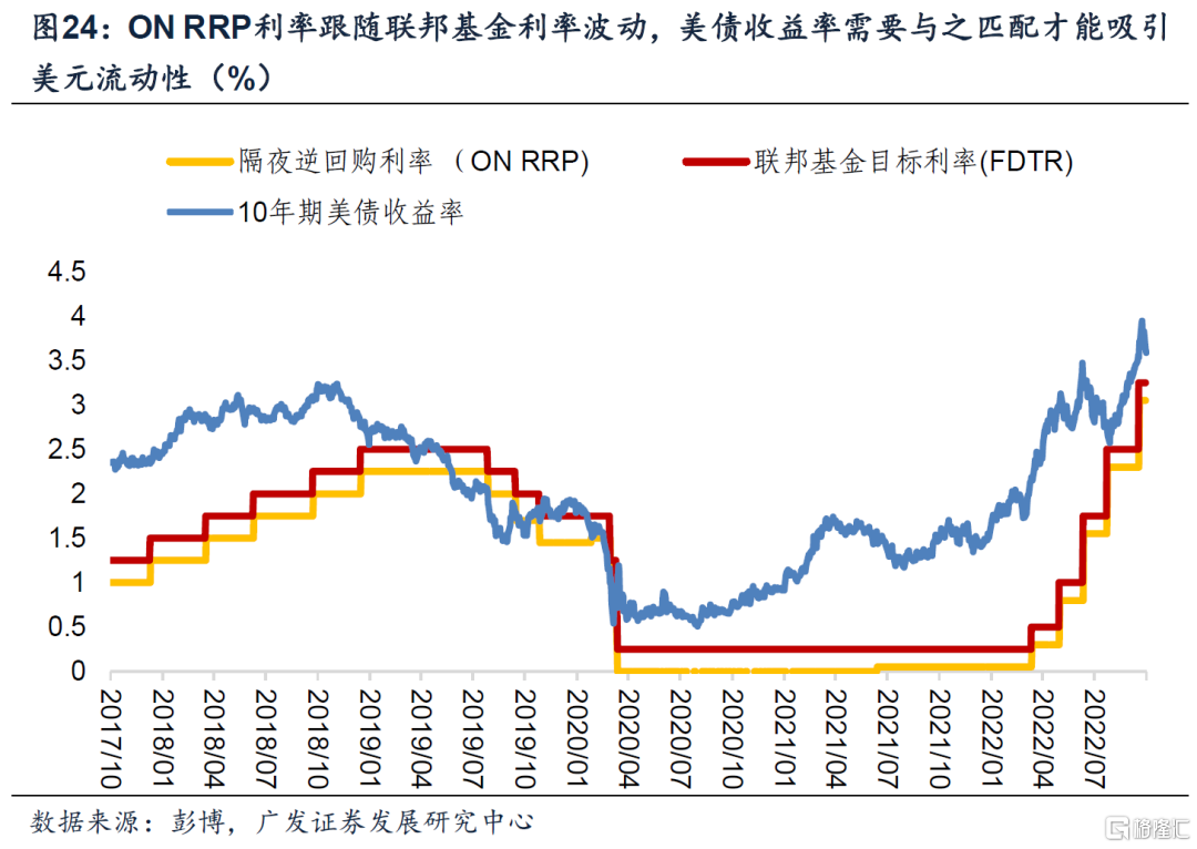 此外,因ON RRP是有抵押物的无风险利率,在某种程度上来说,与美债等资产共同竞争市场美元流动性,因此,若年末联邦基金利率水平上升到4.5%-4.75%,则美债收益率也需要上升到与ON RRP相匹配的水平,才能吸引美元流动性。