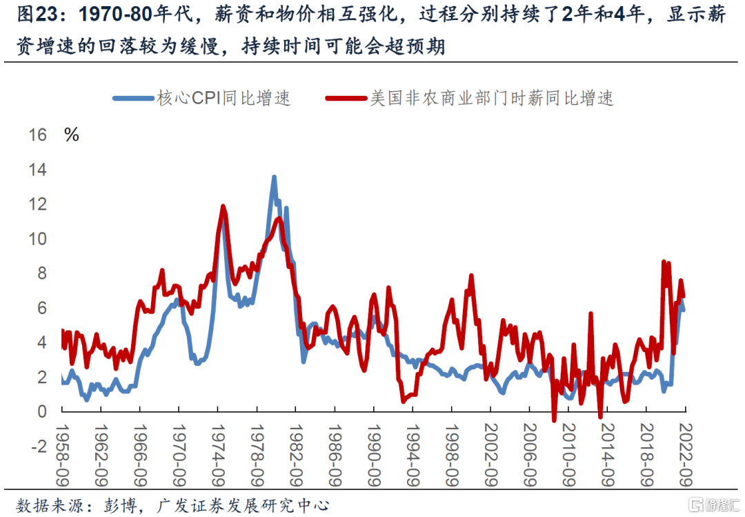此外,借鉴1974年和1976年代薪资和物价的相互强化过程,分别持续了2年和4年,显示物价水平对薪资影响的持续时间可能较长。