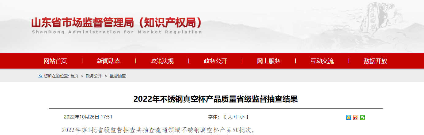 中国质量新闻网讯 据山东省市场监管局网站10月26日消息,2022年第1批省级监督抽查共抽查流通领域不锈钢真空杯产品50批次。抽查发现2批次产品不符合相关标准的要求,不合格项目为保温性能。