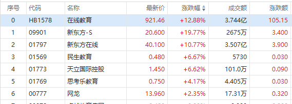 华盛资讯10月27日讯,港股教育板块延续昨日涨势,新东方(09901.HK)涨20%,新东方在线(01797.HK)涨近11%,天立国际控股(01773.HK)涨逾6%。