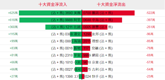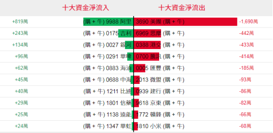 淡仓(认沽证及熊证)方面,周三美团、阿里巴巴、比亚迪股份等相关淡仓分别约625万、618万及360万港元资金净流入;腾讯控股、中国海外发展、汇丰控股等相关淡仓则分别约522万、397万及251万港元资金净流出套现。