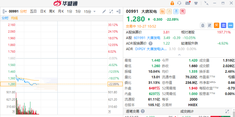 10月27日讯,大唐发电早盘大跌,截至发稿跌22.89%,成交额2.026亿港元。