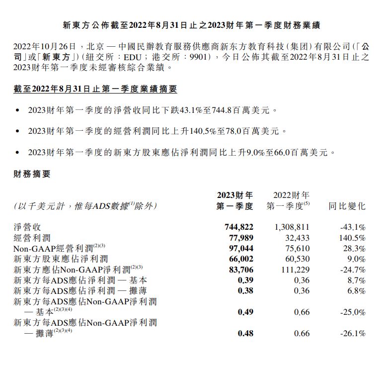 - 新东方绩后单日股价飙涨逾28%,公司昨晚公布2023财年第一财季业绩,营收7.45亿美元,同比减少43.1%,但高于预期;调整后净利润8370.6万美元,同比减少24.7%,但同样高于预期。公司管理层在之后的财报电话会上,强调了新东方线上教育平台新东方在线(Koolearn.com)、子公司核心业务即今年火爆出圈的“东方甄选”对营收的贡献。未来业绩指引方面,公司预计第二财季业绩有所下滑,原因是公司备考课程及出国咨询等部分业务的季节性较强,且第二财季收入通常低于第一财季。