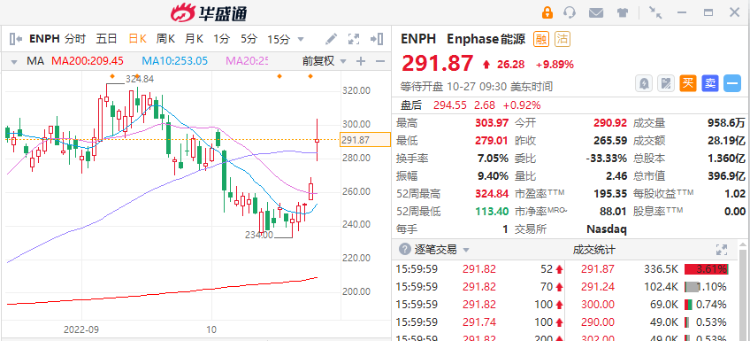 - 太阳能设备公司Enphase能源绩后大涨10%,此前Q3营收超出预期。财报显示,Enphase能源2022财年第三财季归属于母公司普通股股东的净利润为1.15亿美元,同比增长426.44%;营业收入为6.35亿美元,同比上涨80.56%,高于分析师预期的6.177亿美元;调整后的每股收益为1.25美元,高于分析师普遍预期的1.08美元。