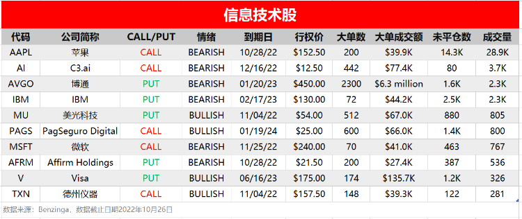 重点动态:博通出现2023年1月20日到期、行权价450美元的看跌期权异动大单,成交2300张,总成本高达630万美元。该大单几乎贡献了该期权链当日的成交量,从成交情况看,该看跌期权被积极买入,显示对博通的看空情绪。