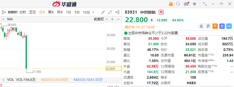 10月27日讯,中创新航(03931)尾盘持续走低跌超34%,低见21.30港元,创上市新低,全日成交额5027万港元。