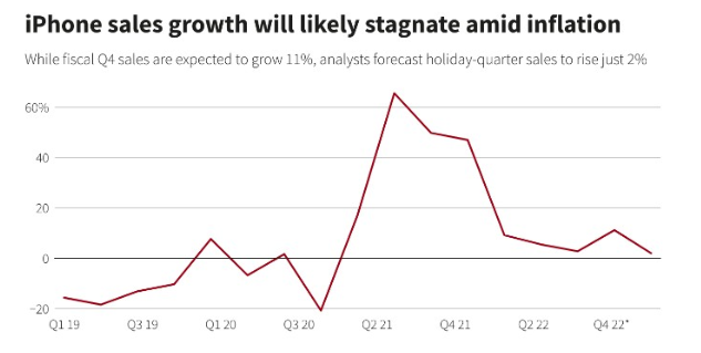 苹果将于本周四美股盘后发布第四季度财报,预计该季度的iPhone销售增长是今年最好的,但它仍可能预示着一个艰难的假期消费季,因为市场需求放缓,通胀达到几十年来的高点。