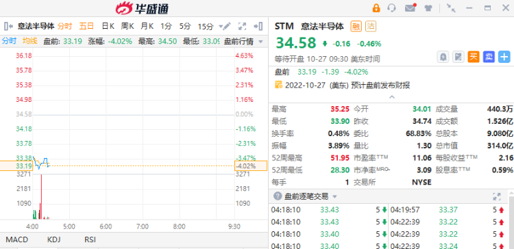 意法半导体公布2022年第三季度业绩。财报显示,意法半导体Q3净营收为43.21亿美元,同比增长35.2%,高于市场预期的42.4亿美元;净利润为10.99亿美元,同比增长131.8%;摊薄每股收益为1.16美元,超出市场预期,上年同期为0.51美元。截至北京时间16:26,意法半导体盘前跌超4%。