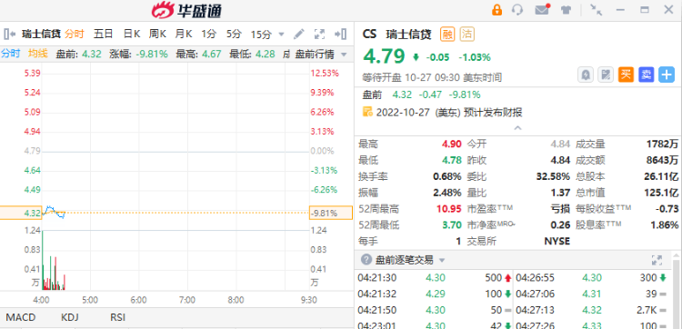 瑞士信贷 $CS 盘前跌近10% 三季度净亏损40.3亿瑞士法郎
