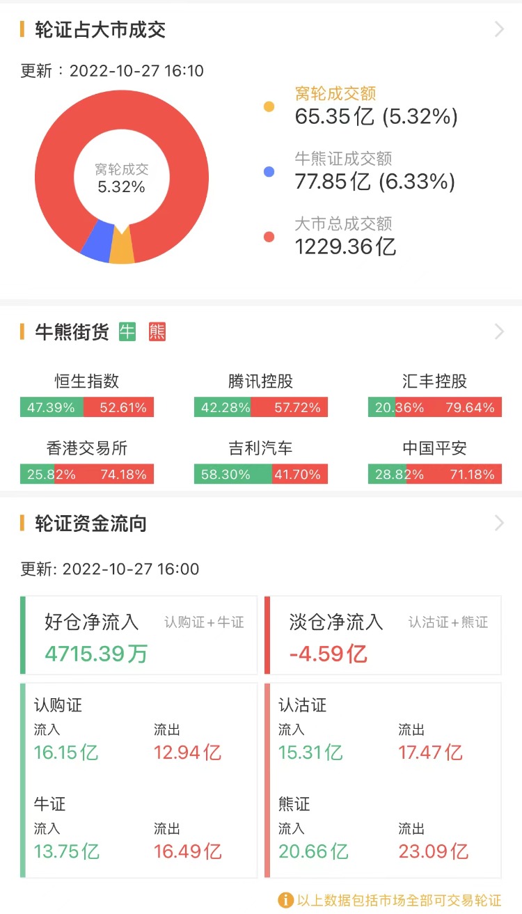 其中,窝轮总成交额为65.35亿港元,牛熊证总成交额为77.85亿港元。