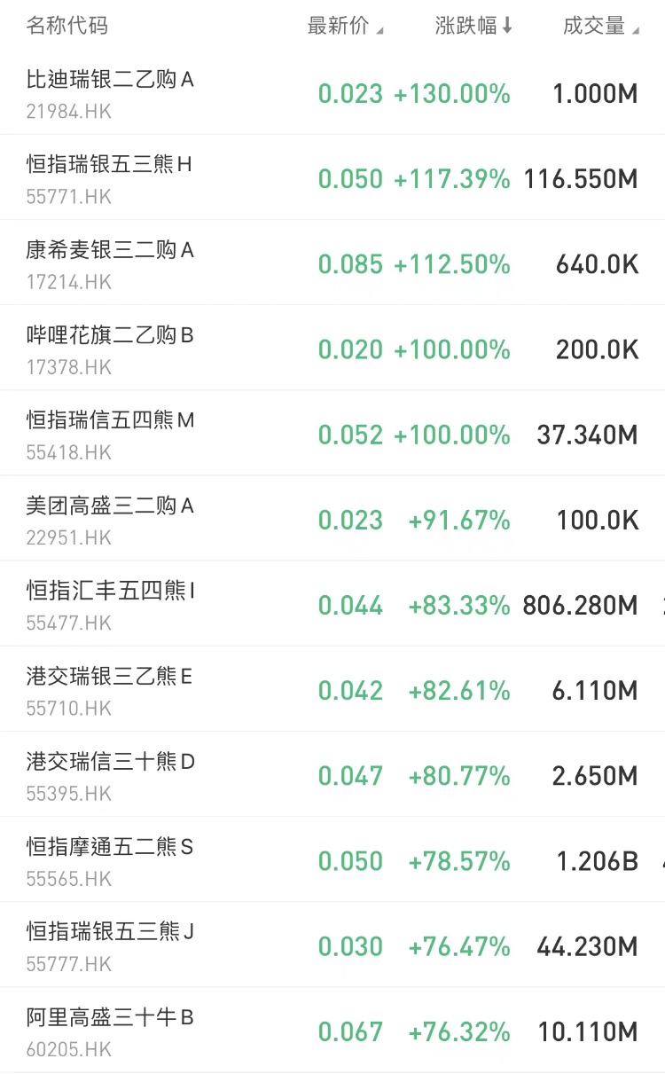 在今日涨幅榜中,比迪瑞银二乙购A涨130%,康希麦银三二购A涨112.5%;此外,哔哩花旗二乙购B涨100%,美团高盛三二购A涨91.67%。