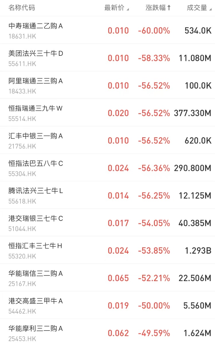 今日所有窝轮牛熊证合计成交143.2亿港元,占大市成交11.65%。