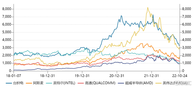 随后,英特尔的市值又先后被英伟达(NVIDIA)、阿斯麦(ASML)超越,开始与AMD、高通“缠斗“。到2022年10月24,台积电市值依然是英特尔的三倍,英特尔市值依然不及高通的1299.8亿美元,仅为1107.4亿美元,比AMD的949.5亿美元并没有高出一个量级。