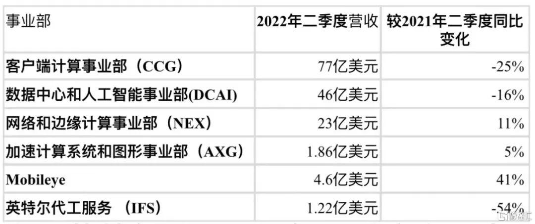 表:英特尔公司2022年二季度主要事业板块营收情况 数据来源:intc.com