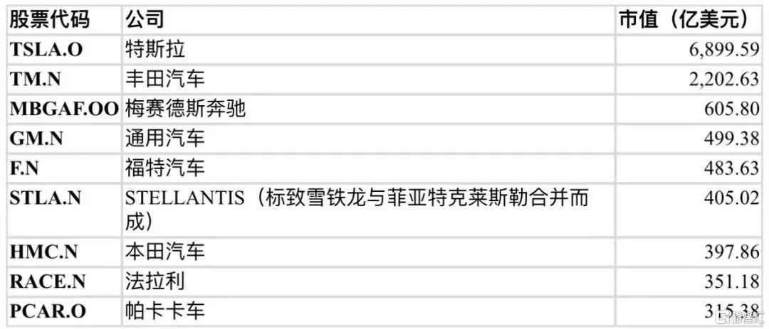 表:美国上市( 交易)的汽车制造类企业市值排名 数据时间:2022年10月18日。 数据来源:wind