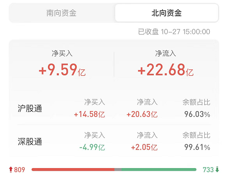 北上资金今日净买入9.59亿元,沪股通净买入14.58亿元,深股通净卖出4.99亿元。上一交易日净买入34.33亿元。