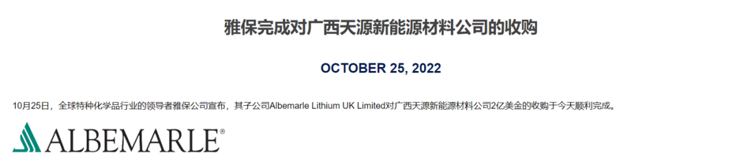 10月25日,全球特种化学品行业的领导者雅保公司在美国北卡罗莱纳州夏洛特市宣布,其子公司Albemarle Lithium UK Limited顺利完成对广西天源新能源材料有限公司2亿美元(14.44亿人民币)的收购。