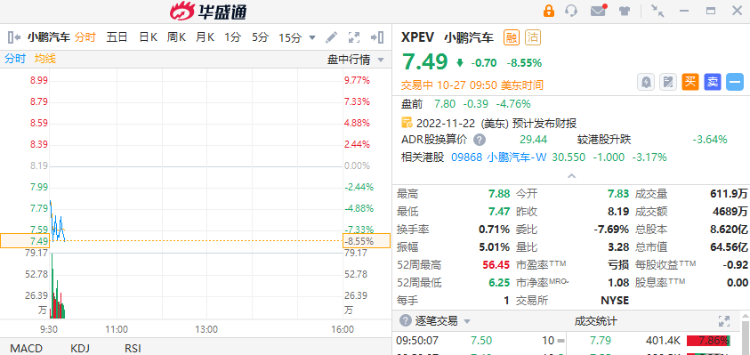 华盛资讯10月27日消息,美股盘初,热门中概股多数走低,截至发稿,小鹏汽车跌超8%,报7.49美元。理想汽车跌超7%,哔哩哔哩、满帮跌超6%,雾芯科技跌超5%,百济神州、好未来、蔚来跌超4%,叮咚买菜、京东、阿里巴巴、百度跌超3%,新东方教育跌超2%。