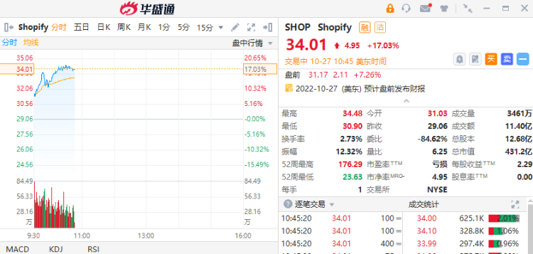 华盛资讯10月27日消息,美股盘中,Shopify走强,截至发稿,现涨超17%,报34.01美元,成交额11.4亿美元。Shopify2022年第三季度总营收为13.66亿美元,同比增长22%,市场预期13.38亿美元;净亏损1.58亿美元,市场预期亏损3.48亿美元。