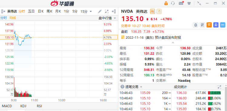 部分科技股上涨,英伟达涨近5%,报135.1美元。台积电、联电涨超2%,推特、格芯涨超1%;谷歌跌幅收窄至1%,Meta跌超22%,股价年内回调70%。