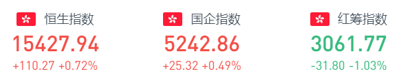 截至10月27日周四收盘,恒生指数涨0.72%,报15427.94点;国企指数涨0.49%,红筹指数跌1.03%。恒生科技指数涨1.11%,京东涨5.86%,阿里涨4.09%,美团涨1.62%。