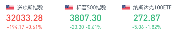 截至10月27日周四收盘,道指收盘上涨197.07点,涨幅为0.62%,报32036.18点;纳指跌178.32点,跌幅为1.63%,报10792.67点;标普500指数跌23.11点,跌幅为0.60%,报3807.49点。