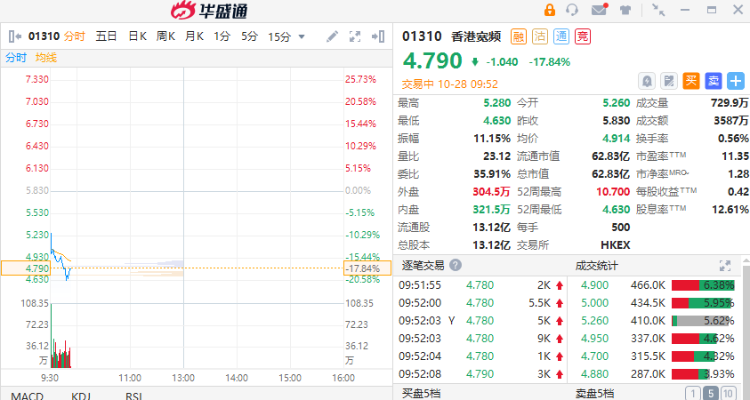 10月28日讯,香港宽频(01310)末期息削减,早盘大幅受挫,最新报4.79港元,跌17.84%,成交额3587万港元。